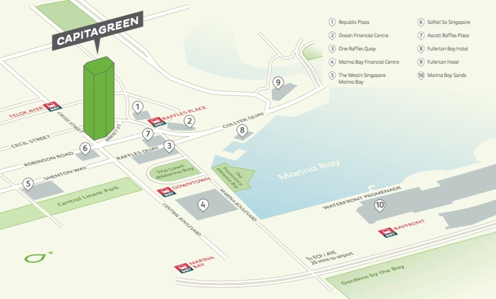 Located in Raffles Place, the heart of Singapore’s Central Business District, the distinctive CapitaGreen offers ease of accessibility to transportation and amenities. CapitaGreen is also in close proximity to the extended downtown at Marina Bay. Businesses locating in CapitaGreen will benefit from its strategic location and being part of Singapore’s vibrant and enlarged business area.